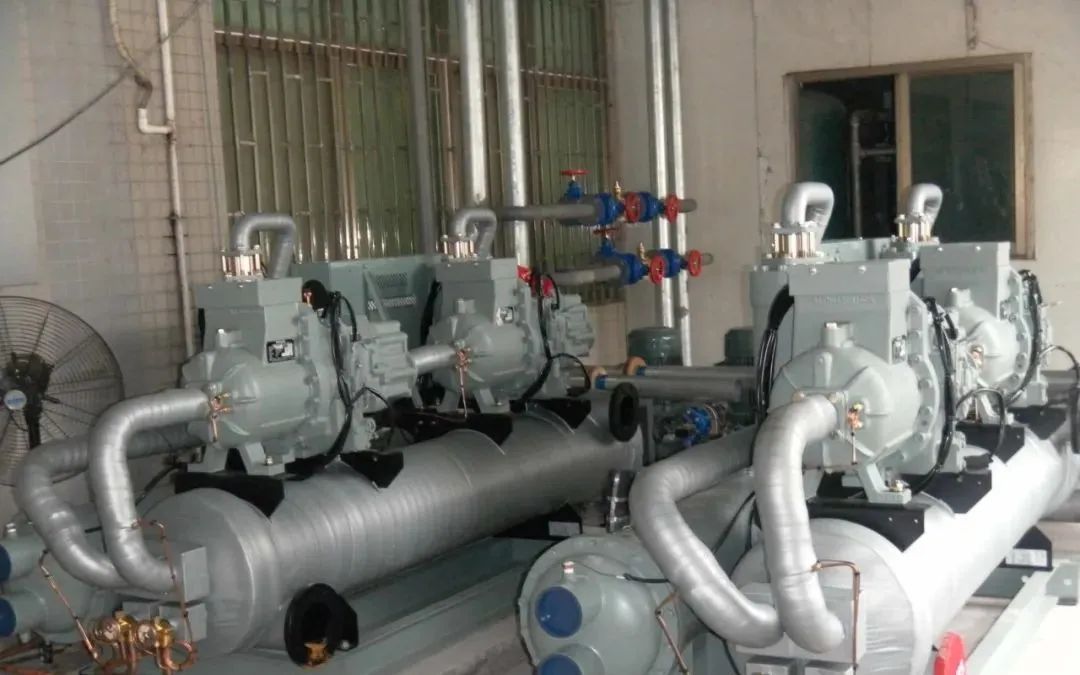 (2)冷媒水流量不足,吸收的熱量少,制冷劑蒸發效果差,而且是過冷過飽和蒸汽,易產生濕壓縮,表現為機組進出水壓力差變小,溫差變大,吸氣溫度低,吸氣口有結霜現象。造成水流量不足的原因是:系統內存有空氣或缺水,解決辦法是在管道高處安裝排氣閥進行排氣;管道過濾器堵塞或選用過細,透水能力受限,應選用合適的過濾器并定期清理過濾網;水泵選用較小,與系統不配套,應選用較大的水泵,或啟用備用水泵。