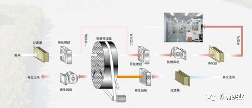 轉(zhuǎn)輪除濕機的工作流程可分幾個部分完成:預冷 / 預熱( 供選件 ) — 轉(zhuǎn)輪除濕 —后冷 / 后熱( 供選件 )