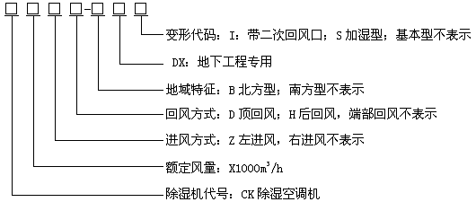 型號示例: CK12-DX 表示名義風(fēng)量為12000m3/h,回風(fēng)方式為端部回風(fēng)的南方型地下工程用除濕空調(diào)機,面對機組控制器,回風(fēng)口在右側(cè)。