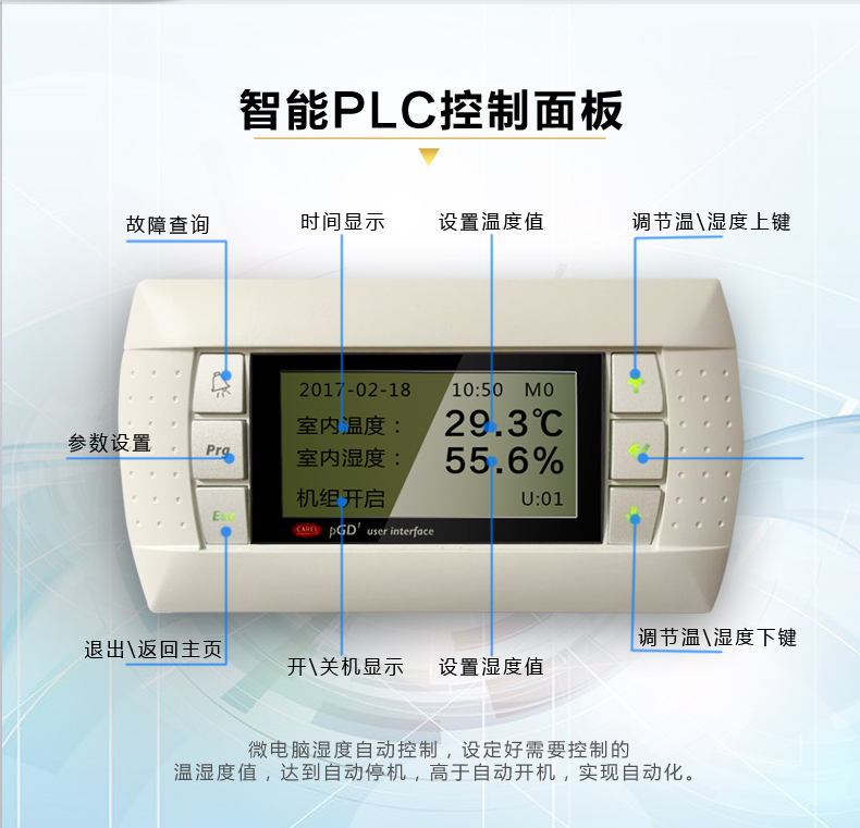 、高性能電子電極加濕器:不滋生細菌,對室內空氣無污染;對水質無特殊要求,無需水處理;獨立加濕器控制板,自動定時換水清洗,延長使用壽命,能自動根據加濕要求控制水位及加濕電極電流,實現高精度控制,真正滿足高精度要求;